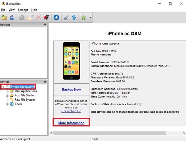 Sau khi iBackup Bot được cài đặt xong, các bạn chạy phần mềm và kết nối iPhone với máy tính bằng cáp lightning. Tiếp đến, chọn tên iPhone và click vào “More Information” như hình dưới đây.
