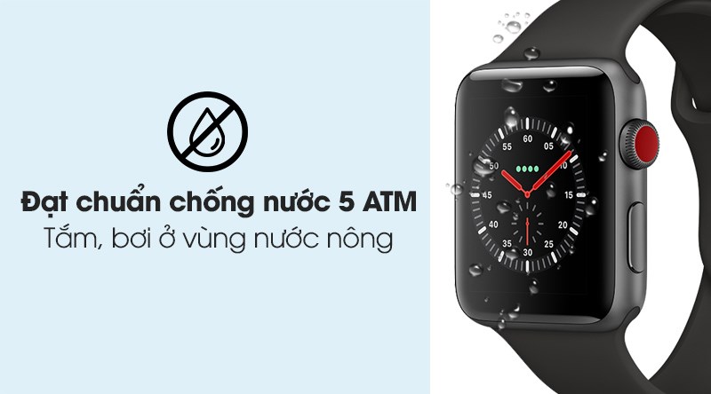 Đồng hồ App watch S3 LTE 42mm đạt chuẩn chống nước 5 ATM (theo tiêu chuẩn ISO 22810:2010), có thể được sử dụng trong các hoạt động dưới mặt nước nông như bơi trong bể hoặc ở biển, không nên sử dụng khi lặn với bình khí, lướt ván nước hoặc các hoạt động khác liên quan đến nước có tốc độ cao hoặc nhấn chìm dưới mực nước nông. Bật tính năng khóa chống nước trước khi mang sản phẩm đi bơi, đi mưa, không ấn các nút điều chỉnh, không dùng trong phòng tắm hơi, tắm nước nóng.