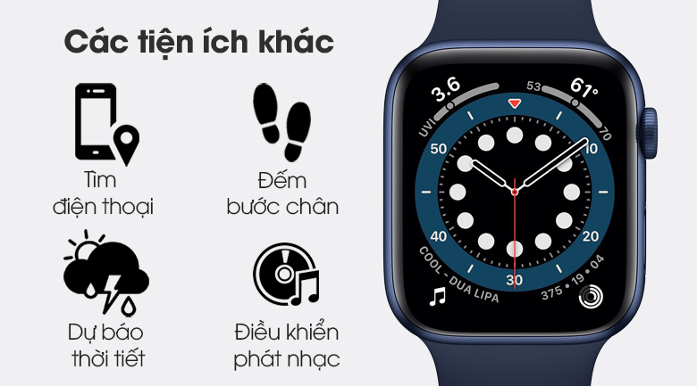Gồm các tính năng khác như: Nghe nhạc, đếm bước chân, dự báo thời tiết, tính lượng calories đã tiêu thụ, tìm điện thoại,…