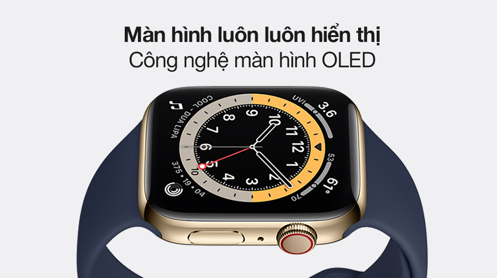 Apple Watch S6 LTE 44mm viền thép dây cao su xanh dương mang kiểu dáng sang trọng, màu sắc hiện đại, trẻ trung. Nó sở hữu màn hình OLED 1.78 inch cho khả năng hiển thị hình ảnh rực rỡ, sắc nét. Mặt đồng hồ được bảo vệ bởi lớp kính cường lực Sapphire có độ cứng cao, chống trầy xước hiệu quả. Dây đeo silicone có độ đàn hồi tốt, không thấm nước, cho cảm giác êm nhẹ suốt ngày dài.
