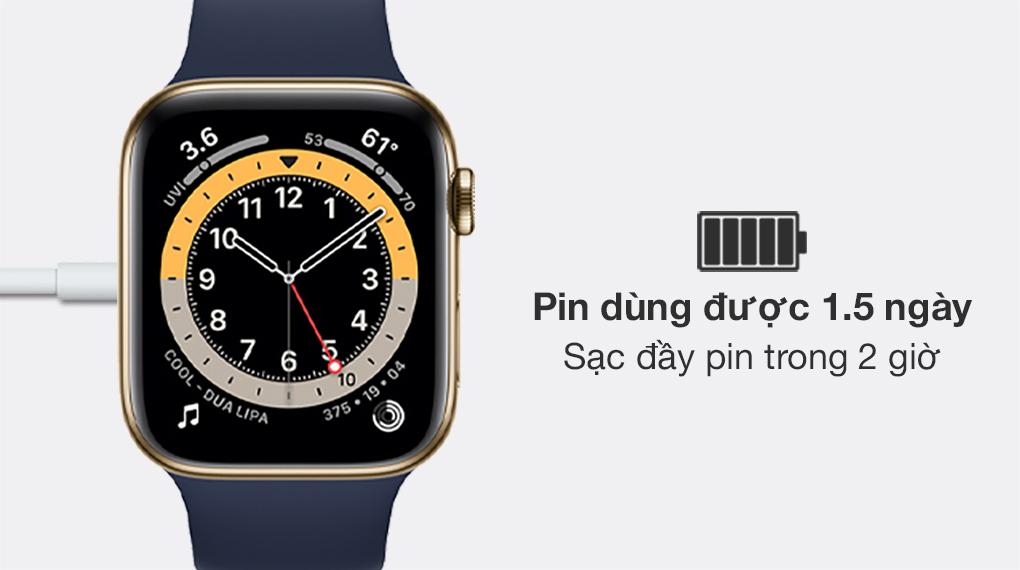 Apple Watch Series 6 có viên pin cho bạn dùng trong khoảng 1.5 ngày và chỉ cần 2 giờ để sạc đầy. Người dùng có thể yên tâm mình sử dụng hết ngày dài mà không sạc giữa ngày.