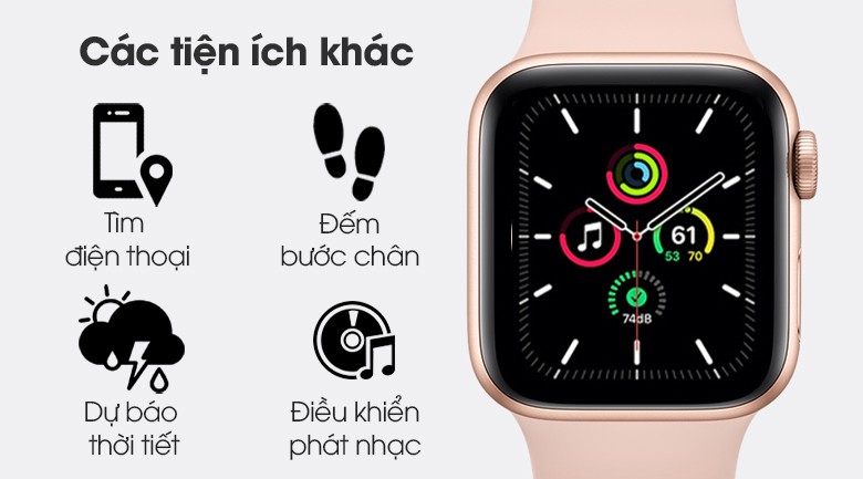 Apple Watch SE 40mm sở hữu nhiều tiện ích khác như: Dự báo thời tiết, la bàn, đồng hồ bấm giờ, điều khiển chơi nhạc, báo thức, tìm điện thoại, đếm bước chân, tính lượng calories tiêu thụ, đếm quãng đường đi được,…