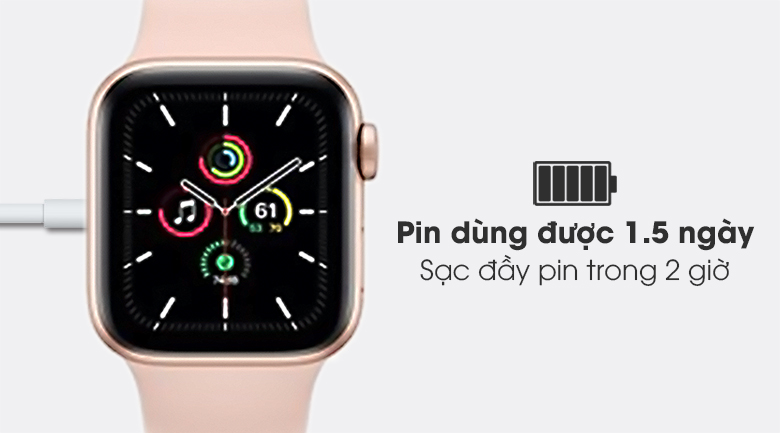 Apple Watch SE trang bị viên pin cho phép dùng được tối đa khoảng 1.5 ngày và chỉ mất khoảng 2 giờ để sạc đầy, giúp bạn có những trải nghiệm trọn vẹn trong ngày mà không lo gián đoạn giữa chừng.
