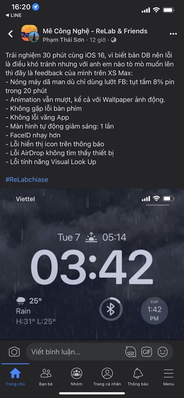 Theo tài khoản Facebook có tên Phạm Thái Sơn (người kiểm duyệt group Mê Công Nghệ – ReLab & Friends), sau khi trải nghiệm bản beta đầu tiên của iOS 16 trên iPhone Xs Max thì bạn ấy đã liệt kê một lỗi vặt như sau: