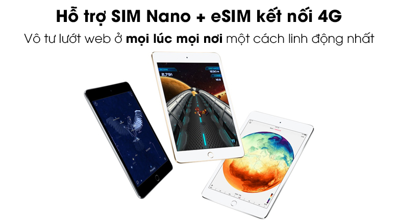 iPad Mini 7.9 inch Wifi Cellular 64GB (2019) hỗ trợ nano SIM và khả năng kết nối 4G LTE, bạn có thể online mọi lúc mà không phải lo lắng như các dòng máy chỉ hỗ trợ wifi khá bất tiện.