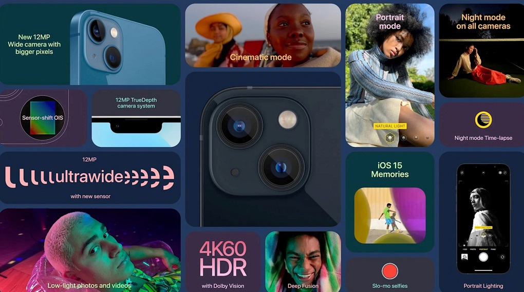 Mặt lưng iPhone 13 mini có hệ thống hai camera cùng độ phân giải 12 MP chất lượng, được bố trí theo đường chéo trong một mô-đun hình vuông, mặt trước thiết bị có camera 12 MP. Hệ thống camera của iPhone 13 mini cho phép thiết bị quay video độ phân giải 4K sắc nét.