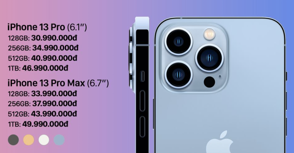 iPhone 13 Pro được trang bị màn hình OLED 6,1 inch tần số làm tươi linh động từ 10 Hz đến 120 Hz. Cụm camera của iPhone 13 Pro có kích thước lớn chứa các cảm biến lớn hơn so với tiền nhiệm. Cụ thể, camera góc thường có khẩu độ f/1.5, camera góc siêu rộng hỗ trợ lấy nét (autofocus) có khẩu độ f/1.8 lớn hơn. Trong khi đó, camera tele có tiêu cự 77 mm, giúp đem đến khả năng zoom quang học 3X (so với 2.5X của iPhone 12 Pro Max).iPhone 13 Pro được trang bị con chip A15 Bionic mới với 2 nhân hiệu năng cao, 4 nhân tiết kiệm điện và 5 nhân GPU. Máy có các phiên bản bộ nhớ 128 GB, 256 GB, 512 GB và cả 1 TB, màu Graphite, Gold, Silver và Sierra Blue. Giá khởi điểm của iPhone 13 Pro là 999 USD.