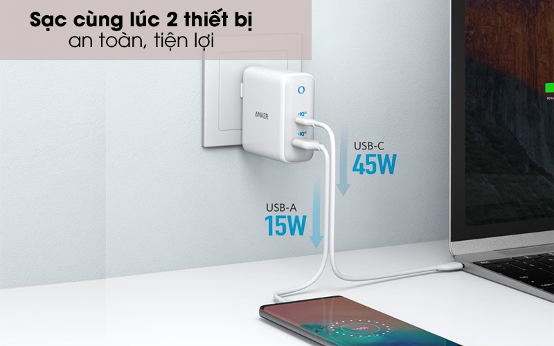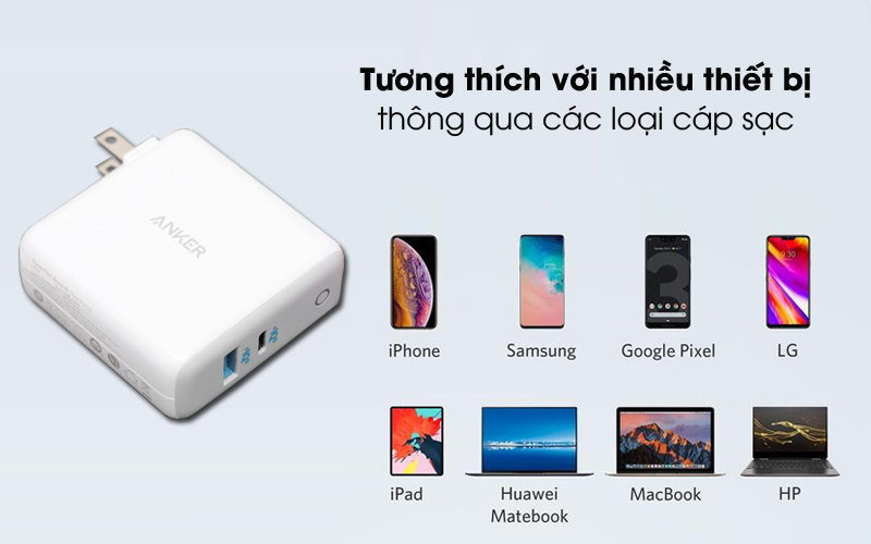 Sạc 2 cổng USB Type C PD 60W Anker PowerPort Atom dùng được cho nhiều loại thiết bị như điện thoại, máy tính bảng, laptop, pin sạc dự phòng… thông qua các loại cáp phổ biến