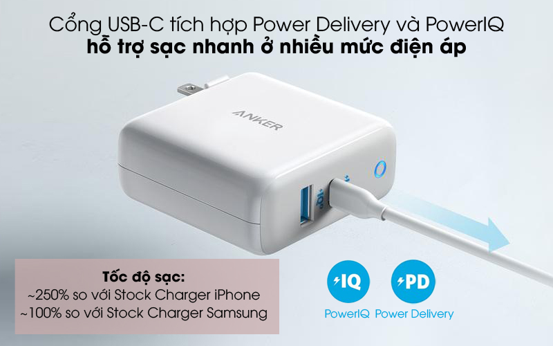 Cổng sạc USB-C tích hợp đồng thời 2 công nghệ sạc nhanh Power Delivery và PowerIQ, tương thích với nhiều thiết bị ở mức điện áp khác nhau