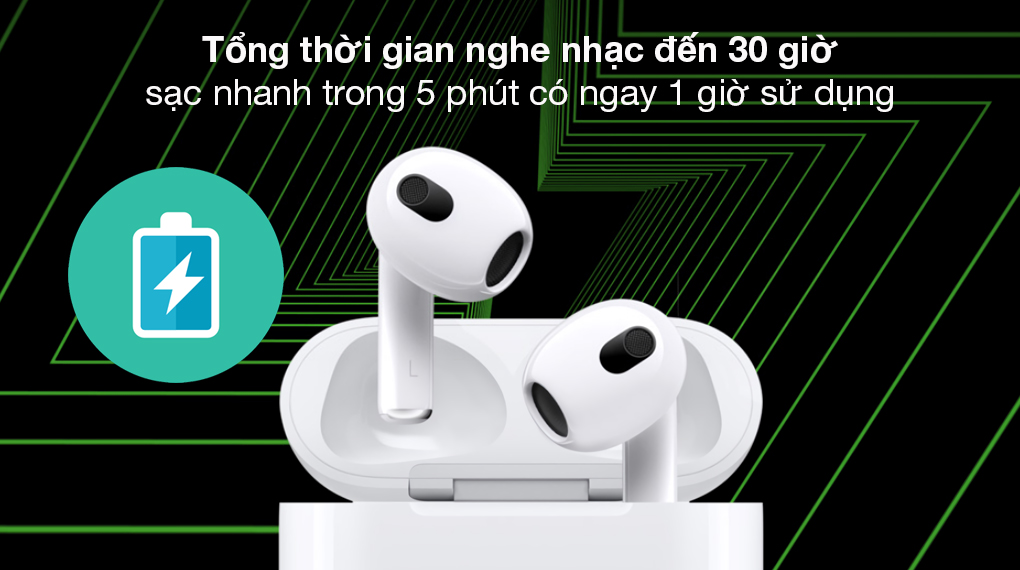 Sạc nhanh 5 phút cho thời gian nghe và đàm thoại khoảng 1 giờ. Lựa chọn sạc pin cho thiết bị khá linh hoạt, khi bạn có thể sạc qua dây cáp hoặc sạc không dây chuẩn Qi, tùy theo từng hoàn cảnh, nhu cầu mà bạn chọn cách sạc tai nghe Apple tiện ích nhất.